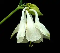 The shape of the cups has been compared to the inverted flower of Aquilegia vulgaris which was thought to resemble a group of doves clustered together, resulting in the flower's common name of "columbine" from the Latin columbinus, meaning "like a dove".[1] The word also gave its name to the bird family Columbidae, the dove genus Columbina, and the character of Columbina (the "little dove") in the theatrical genre of Commedia dell'arte.[1]