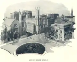 The circle began as a "quietly residential place with several churches within walking distance". In the early 1900s it began to develop with the construction of buildings including the Syracuse Public Library and Onondaga County Courthouse. As the century progressed further commercial and governmental buildings were built in the area surrounding the circle.[1] From 1913 to 1933 Syracuse held an annual Christmas tree lighting during the Christmas and holiday season at the circle.[10] The tree lighting began as a project headed by the Syracuse Consumers' League and was funded by groups including the cities Chamber of Commerce, Rotary Club, and the Syracuse Herald. The tree was 50 feet (15 m) tall and supplied by the New York State College of Forestry. The Parks department oversaw its installment, while lights were supplied by the Syracuse Lighting Company.[11] In 1933 the tree lighting was moved to Clinton Square.[10]