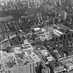 San Juan Hill was mostly erased due to the mid-20th-century sweep of urban renewal to create Lincoln Center, displacing thousands of families, and removing the history that the neighborhood existed.[14] In the early 20th century African-Americans started to move uptown from San Juan Hill to Harlem. The African-American population decreased while the Puerto Rican population grew. More Puerto Rican families started moving there in the 1950s coinciding with a massive influx of Puerto Rican migration after World War II. In the 1940s the neighborhood of San Juan Hill was designated as a slum and called "the worst slum district of New York City" by the New York City Housing Authority.[15] The area had been the home of over 17,000 residents.[16][6] Construction on the development project started in 1959.[17]
