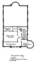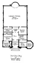 The rear half of the building held the two-story Library Hall, an ornate room measuring 52 by 59+5/6 feet (15.8 m × 18.2 m). The hall was intricately decorated, with globe lights brightly lighting the room and shimmering against the blue tints and gold in the ceiling and walls.[1] The space, originally the church's sanctuary, had a drop ceiling supported by steel beams. The ceiling was described as a "work of art" with rich paneling. The southern end of the room, facing the lobby and arched entranceway, held a 26-foot-long issuing counter. The counter was screened at each end with copper grill panels, connected beneath a metal arch studded with electric globe lights. Originally, the hall ceiling was arched high against the roof, altered during the remodel into the library. Much of the floor was used for bookcases – fifteen double cases finished in antique oak, each able to hold 2,000 volumes. Eight were at the left, seven at the right, with a 20-foot-wide hall between them, holding distributing tables along with cabinets holding the card catalogue. At the back of the room was the cataloguing room, with shelving for 1,500 volumes.[4]