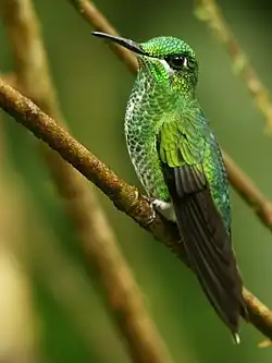 Columnea consanguinea have relatively small and drab flowers. In order to attract their main pollinators, the nectarivorous green-crowned brilliant (Heliodoxa jacula),[4][5] they instead use the markings on their leaves. Sunlight filtering through the translucent patches on their leaves give them a brilliant red color, reminiscent of stained-glass windows.[6] Hummingbirds, like all birds, possess excellent color vision greater than that of humans. They are attracted to the red color of the markings and can then find their way to the flowers to feed. In doing so, they pollinate the flowers of C. consanguinea.[7]