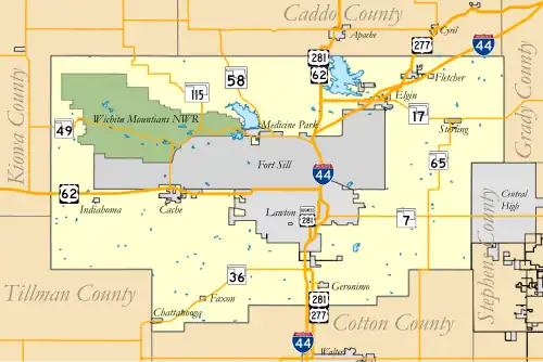 There are three cities in Comanche County. The largest, Lawton is located in the center of the county and is the county seat.[17] According to the US census, the population of Lawton was 96,867 in 2010, which is 78 percent of the county's population. Cache is located to the west of Lawton on US Highway 62 and has a population of 2,796. In the northeast, Elgin is located along Interstate 44 and has a population of 2,156. Several towns dot the county including: Fletcher, Sterling in the northeast, Medicine Park in the north central region, Indiahoma in the west, Geronimo in the southeast, and Chattanooga and Faxon in the southern regions of the county.[18] Also located in Comanche County is Fort Sill. The 90,000 acre installation is home to the US Army Field Artillery Training Center and the Air Defense Artillery.[19]