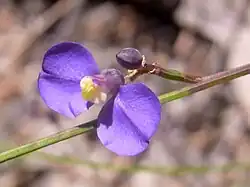 The habitat is sandy soils in heathland or low eucalyptus country, sometimes in high rainfall areas. The specific epithet sphaerocarpum is from the Ancient Greek, referring to the ball-shaped fruit. The attractive violet or blue flowers form from October to May. The width of the flower is around 1 cm (0.5 in). The fruit is somewhat broadly triangular or round, and tapers to the stem, although not as prominently tapered as are other plants in this genus.[7] The fruit is 4 mm long.