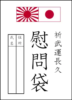 Comfort bag (慰問袋, imon-bukuro) was a gift packet prepared by civilians to be sent to Imperial Japanese Military soldiers for the purpose of encouraging them. The bag contains comfort articles (慰問品, imon-hin) not issued by the Japanese Military, such as toiletries, dried fruits, canned foods, and letters of encouragement. Bags were prepared by schoolgirls or local patriotic women's societies (Greater Japan Women's National Defense Association). Comfort bags were also sold commercially, even in upscale supermarkets and marketed in cosmetic magazines to wider consumer market. [1] These activities were also made in Korea, which was then under Japanese rule, to encourage Korean soldiers in the Imperial Japanese Military.[2][3][4]