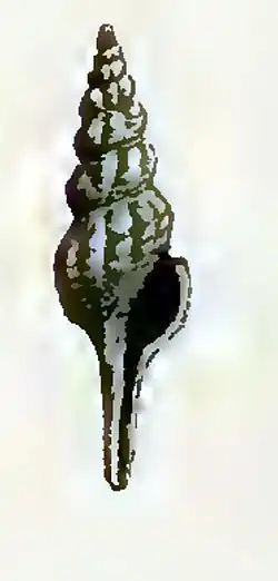 (Original description) The shell is of small to medium size, somewhat narrow elongate fusiform. The aperture and the siphonal canal have about the same length as the spire. The spire is acute, made up of a rather small embryonic portion, succeeded by numerous, gradually increasing, convex, and more or less strongly costated whorls. The apical angle is about twenty-five to thirty degrees. The protoconch is rather small, consisting of about 1+1⁄2 smooth convex whorls. The spire consistis of seven or eight regularly convex whorls, with their greatest convexity about the middle of each whorl, and with a well-impressed suture.. The aperture is oval. The outer lip is rather thin and smooth internally, with a well-defined broad but comparatively shallow sinus just below the suture. From the sinus the lip projects slightly forward with a regular convex arch, then curving downwards to join the anterior canal. The sinuses about one to one-and-a-half millimetre broad, but usually only about half this measurement in depth. At the anterior end the aperture opens into a long, straight, slender and open siphonal canal, which is much longer than the aperture. The inner lip shows a thin enamel coating. The columella is simple and smooth, straight, slender, and gently tapering to the anterior end. The surface is ornamented with oblique ribs, which are most highly elevated about the middle of each whorl, and fade off more rapidly towards the posterior suture than the anterior. The ribs number usually nine to a whorl, an occasional example shows as many as eleven or twelve on the body whorl. The strength of development of the ribs is somewhat variable, especially on the anterior whorls, where they are occasionally only just visible. The ribs are traversed by comparatively coarse and fine spiral threads. Of these there are four to six coarser and more prominent than the rest, situated in the anterior two-thirds of each whorl, especially prominent where they cross the ribs, more numerous, amounting to about eight or nine, on the body whorl, with much broader interspaces between each of which has a medial finer thread with a pair of still tinier threads on either side of it. The posterior third is occupied by from about ten to fifteen very fine spiral threadlets, also the fine lines of growth of the sinus are in this space. Both ribs and spiral threads are traversed by the fine oblique forwardly directed lines of growth.[2]
