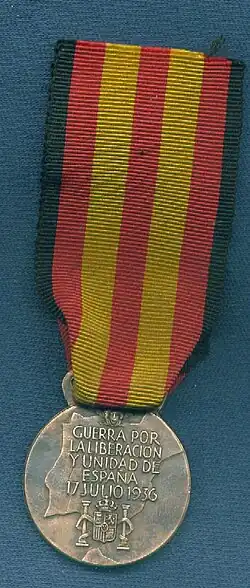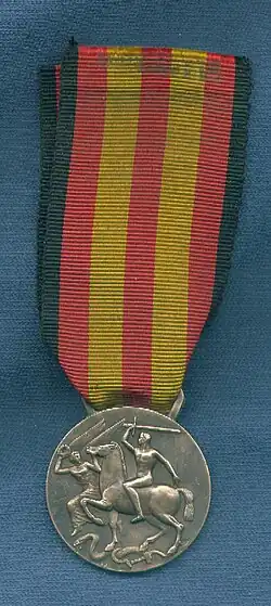 The Commemorative Medal of the Spanish Campaign (Italian: Medaglia commemorativa della campagna di Spagna) was a decoration awarded by the Kingdom of Italy during its period of Fascist rule under Prime Minister Benito Mussolini to personnel who took part in the Italian military intervention in Spain during the Spanish Civil War of 1936–1939.