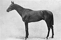 Common was a “big, lathy, sinewy” [1] brown horse, standing just over 16 hands high[2] bred at Crichel in Dorset by Henry Sturt, 1st Baron Alington[3] who owned him during his racing career in partnership with Sir Frederick Johnstone.[4] The colt was sent into training with John Porter at Kingsclere,[5] and was ridden in all his races by George Barrett.[6] Common's sire Isonomy was one of the outstanding British racehorses of the 19th Century,[7] winning the Ascot Gold Cup in 1879 and 1880. He went on to become a successful stallion; apart from Common he sired Isinglass, thus being the first of two horses to father two winners of the English Triple Crown. Common's dam Thistle, who had been a successful racehorse,[8] went on to produce the New Stakes winner Goldfinch and the filly Throstle who won the St Leger in 1894.[9]