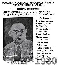 The PKP formed the Democratic Alliance, supporting Osmeña in the 1946 Presidential elections in an effort to defeat Manuel Roxas, who was seen as the lesser of two evils.[3] The DA fielded candidates for Congress and Senate, including Vicente Lava, who was part of the PKP's Central Committee at the time.[2] Six congressional candidates won, including Taruc, Juan Feleo, and Jesus Lava,[2] but were prevented from taking their oaths in Congress by the Roxas administration, due to their opposition to the Bell Trade Act.[21]
