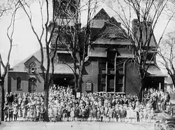 The Como neighborhood, with its founding, mill and rail industry-adjacent locale and immigrant demographics, all represent the industrial expansion period in the U.S.[4] During this time, Como Congregational was a notable public activities site for many causes and issues that define the Progressive Era social scene during the 1890s to 1920 time span: citizen participation and suffrage, reform of civic corruption. public health and food safety (water, dairy), labor reform, children's and family welfare and education (including temperance), and city beautification.
