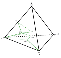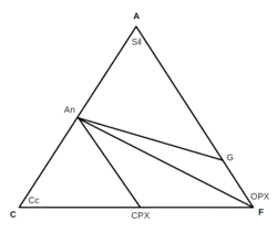 That is, the components are various combinations of the mol% of important metal oxides in the rock. If the rock is assumed to be saturated with quartz and carbon dioxide (though not depicted in the diagram), then at elevated temperature (granulite facies), the corner phases are calcite, sillimanite, and orthopyroxene. The side of the diagram between calcite and sillimanite has a point added for anorthite (calcium feldspar), corresponding to an equal mixture (by mole percentage) of the two components. This forms pure anorthite. Likewise, points are added for clinopyroxene and garnet and the diagram is divided into subtriangles, as depicted in the accompanying diagram.[6]