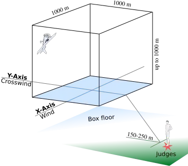 The box floor is as high as 460 metres (1,510 ft) above ground level (AGL) for Primary level competitors and as low as 100 metres (328 ft) AGL for Unlimited level competitors. The box ceiling is as high as 1,000 metres (3,280 ft) above its floor. Before a category starts, a competitor will mark the box by flying along its boundaries at its floor. This allows the judges to visualize the box in the sky and prepares them to adjudge an aircraft flying below the box floor.