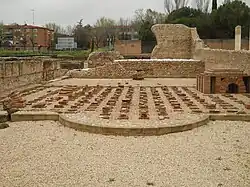 The north baths of the 1st century were attached to the early basilica. The caldarium consisted of a large heated room with opus signinum floor over a hypocaust whose heat was produced in a praefurnium of two large ovens located to the south. An apse on the south side included a hot water pool above which windows made the most of the sun. At the end of the 3rd century the baths were transformed into the curia, the meeting place of the senate. The hypocaust heating system was preserved to serve the senate members.