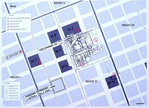 15 decumani and 16 cardines were traced, occupying an approximate area of 48 hectares that housed 10,000 to 15,000 inhabitants in its heyday before the crisis of the 3rd century. The two main avenues, the cardo maximus and the decumanus maximus, intersected at the forum with the commercial areas, the main public and religious buildings, and the houses of the most important citizens.[9]