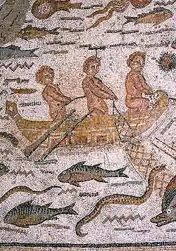 Although known as the House of Hippolytus, it was in fact the headquarters of the Youth College and all the rooms were related to leisure.[14] The largest room has a large mosaic with a fishing scene. The work is signed by Hippolytus, a master mosaicist of possibly North African origin (present-day Tunisia is the most feasible place) and was made for one of the most important families in the city.[15]