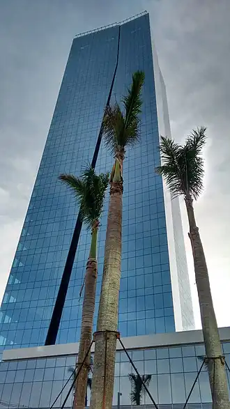 The project belongs to the American real estate developer Tishman Speyer and Brazilian construction company Costrutora Caparaó, which, according to Daniel Cherman, president of Tishman Speyer, was built "[...] because Belo Horizonte was lackning of a high-quality mixed-use development project".[5] The building has 44 floors, with 31 commercial floors, 8 parking floors, 4 residential lofts (one per floor) and a helipad, as well as space for shops and a restaurant on the ground floor. Its core was built in concrete, but the structure is predominantly in steel, with steel deck slabs and is covered by a glass curtain. The shape appears to be that of a prism, but the four sides have slits that give it a shape similar to a pinwheel. In addition to the aesthetic purpose, the slits serve to ventilate the floors and allow air to enter the building's central cooling system.[4]