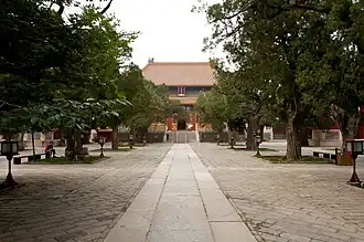 The complex includes four courtyards aligned along a central axis. From south to north, noteworthy structures include the Gate of the Late Master (先师门, Xianshimen), the Gate of Great Accomplishment (大成门, Dachengmen), the Hall of Great Accomplishment (大成殿, Dachengdian), and the Hall for Admiration of the Sage (崇圣祠, Chongshengci).[2] Inside the temple, there are 198 stone tablets positioned on either side of the front courtyard, recording the names of more than 51,624 jinshis (advanced scholars) of the Yuan, Ming and Qing dynasties. There are also 14 stone stele pavilions of the Ming and Qing dynasties that hold various historical documents from late imperial China.[2]
