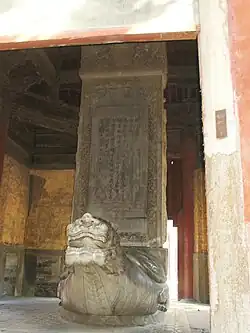 There are various carvings inside the temple ground. One notable example is a famous carving of "two flying dragons playing with a pearl among the clouds"; the image is rare among Confucius temples since it was often reserved for emperors.[2] The temple also contains stone steles containing the Thirteen Confucian Classics, presented to the temple by the city of Jintan in Jiangsu Province.