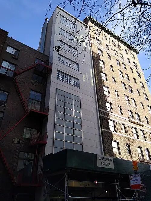In 1993, having outgrown its borrowed space, the congregation purchased the former Waldensian Church at 127 East 82nd Street and refurbished it as a synagogue. The first service was conducted there in May 1993. The building itself had a rich and interesting history as a house of worship: it was built in the early 1880s as a synagogue by Congregation Kehilath Jeshurun; was sold in 1904 and occupied by a series of synagogues until 1950; then was bought by the Waldensian Evangelical Church.[1] At the time of the sale to Or Zarua, the church was the only remaining Waldensian congregation in New York City.[2] The Waldensians—a Protestant sect originating in northern Italy and Switzerland—had been instrumental in saving Jews from the Fascists during the Second World War.
