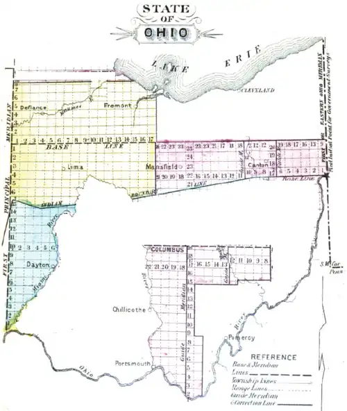 Congress Lands in northwest Ohio consist of North and East of the First Principal Meridian and South and East of the First Principal Meridian. These lands are south of a narrow strip next to the Michigan border, west of the Firelands and the Congress Lands North of Old Seven Ranges, North of the Greenville Treaty Line and the Virginia Military District, and east of Indiana. Townships are surveyed north and south from the baseline at 41 degrees north, and are designated “Township X N, Range Y E of First Principal Meridian” or “Township X S, Range Y E of First Principal Meridian”.
