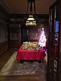 The first parlor, also known as the "blue room" or "Music room" features blue wallpaper inside of decorative wall moldings and is the scene of most seasonal celebrations. During the Christmas season the largest tree is placed in the bay window of this room. It houses the grand piano and Victrola, among other instruments.
