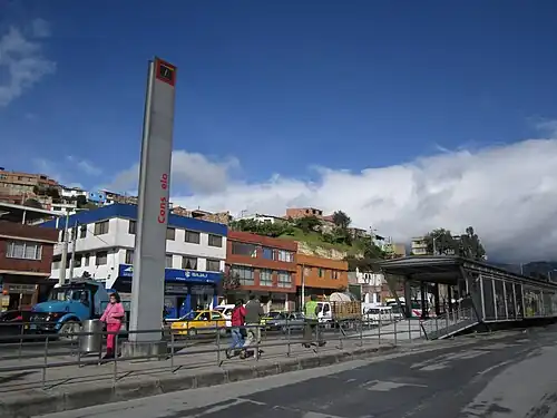 The simple station Consuelo is part of the TransMilenio mass-transit system of Bogotá, Colombia, opened in the year 2000.