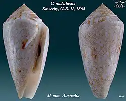 | Apertural and abapertural views of shell of Conus nodulosus Sowerby, G.B. II, 1864 | |