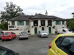 The first cafe at the falls was simply a wooden hut.[8] In 1938 the Welsh architect Clough Williams-Ellis was consulted with regard to the design of a new building, the original design being for a building perched on the rocks above the falls, but this was never built. The current building dates from the 1950s and, although rather different from Williams-Ellis' design (drawings of which are displayed in the cafe's main room[8]), is nevertheless an excellent example of his style, the cafe being "provided with a pediment in the Georgian style and an open loggia on the upper level."[9]