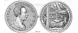 In 1726, prompted by the Harveian Oration by Richard Mead,[12] with an appendix by Edmund Chishull, Middleton offended the medical profession with a dissertation[13] contending that the healing art among the ancients was exercised only by slaves or freedmen. He was answered by John Ward, Joseph Letherland, and others, to whom Middleton replied.[14] Middleton let the matter drop after meeting Mead socially; but two related works, an Appendix seu Definitiones, pars secunda and a letter from Middleton to another opponent, Charles La Motte, were later published in 1761 by William Heberden the elder.[3]