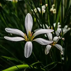 Although Cooperia was considered distinguishable from the better known rain lily genus, Zephyranthes, by its fragrance similar to primroses, its white or yellow pollen, its tolerance for drout and desert conditions (Howard 2001:54) and tendency to be night-blooming (Ogden 1994:11), it is now considered to be part of Zephyranthes and the genus name Cooperia is no longer accepted.[1][2]