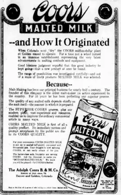 The Coors Brewing Company managed to survive Prohibition relatively intact. Years before the Volstead Act went into effect nationwide, Adolph Coors established the Adolph Coors Brewing and Manufacturing Company, which included Herold Porcelain and other ventures, with sons Adolph Jr., Grover and Herman. The brewery itself was converted into a malted milk and near beer production facility. Coors sold much of the malted milk to the Mars candy company to produce sweets. Manna, the company's non-alcoholic beer replacement, was a near-beer similar to current non-alcoholic beverages. However, Coors and his sons relied heavily on the porcelain company and a cement and real estate company to keep the Coors Brewing Company afloat. By 1933, after the end of Prohibition, the Coors brewery was one of only a handful of breweries that had survived.[4]