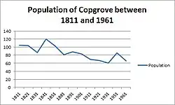 Between 1811 and 1961 records of the population of Copgrove are available and these show that from 1811 the population remained fairly constant for the next 10 years before making a dip to 87 in 1931. 1940 had the biggest increase in population rising to 120 inhabitants. After 1891 the population of the Parish continued to decrease down to its lowest number of 60 in 1931. In 1951 however the population was recorded at 86.[10] This could have been because of the baby boom that occurred between the late 1940s and early 1960s.[11]