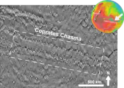 Coprates Chasma (/ˈkɒprətiːz ˈkæzmə/) is a huge canyon in the Coprates quadrangle of Mars, located at 13.4° south latitude and 61.4° west longitude, part of the Valles Marineris canyon system. It is 966 km (600 mi) long and was named after a classical albedo feature name.[1] It was named from the classical Greek name for the Dez River in Persia.