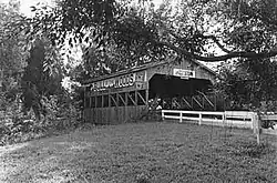 James S. Hunt contacted the American Snuff Company in Winston-Salem, North Carolina, for chewing tobacco designs to make the bridge appear more "seasoned". The company supplied two designs plus an artist to paint the murals. The Bull of the Woods logo on the east side of the bridge was first used in 1876. The Peach Snuff logo on the west side was created in 1950 to appeal to a broader female audience.[1]