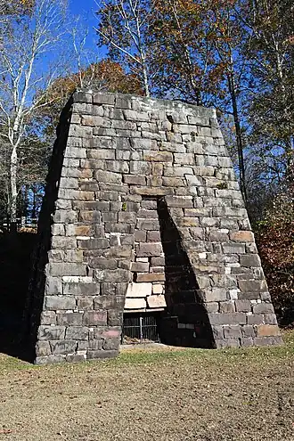 The furnace is roughly pyramidal in shape, 30 feet (9.1 m) square at the base, 15 feet (4.6 m) square at the top, and 45 feet (14 m) tall. It is built of large hematite blocks quarried from Dirt Cellar Mountain and brought the three miles (4.8 km) to the site by ox cart.[2] A half-mile (0.8 km) long mill race was constructed from the Chattooga River through a tunnel under a hill to power a water wheel which provided the air blast to operate the furnace. A bridge, no longer extant, spanned from the hillside to the top of the stack, where iron ore was loaded into the furnace. A gristmill and sawmill were also located on the site.[3]