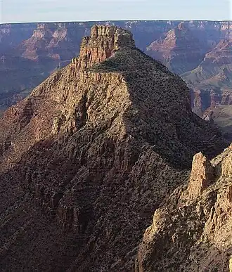 Coronado Butte is a 7,162-foot (2,183 m)-elevation summit located in the Grand Canyon, in Coconino County of Arizona, United States.[3] It is situated one mile (1.6 km) west of the Moran Point overlook on the canyon's South Rim, and one mile northeast of Sinking Ship, its nearest higher neighbor. Topographic relief is significant as this butte rises 4,600 feet (1,400 m) above the Colorado River in 2.5 miles (4.0 km). Coronado Butte is named for Francisco Vázquez de Coronado (1510–1554), the explorer whose 1540 expedition was the first European sighting of the Grand Canyon, among other landmarks.[4] This geographical feature's name was officially adopted in 1906 by the U.S. Board on Geographic Names.[3] The first ascent was made by John Hance and tourist prior to 1900, in the 1890s.[5] According to the Köppen climate classification system, Coronado Butte is located in a cold semi-arid climate zone.[6]
