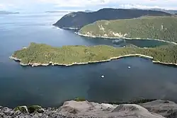 Coronation Island is located in Alaska off the northwest coast of Prince of Wales Island, south of Kuiu Island, and west of Warren Island. High prevailing winds and waves from the open ocean to the west, combined with a steep, rocky coast, result in virtually unaccessible shore due to heavy surf along the windward (western and southwestern) coastline of the island. The few protected coves and beaches along the leeward (eastern and northeastern) shore are guarded by rocky shoals. Thus, the island is difficult to access by any route, and is generally limited to small boat or floatplane during brief lulls in the weather. There are no developed facilities and no groomed trails on the island. Wilderness camping is unrestricted and fishing and hunting are allowed.[1] The nearest full-service community is Craig, Alaska. The island is also home to the Coronation Island Wilderness, which encompasses 19,232 acres (78 km2) and includes the adjacent Spanish Islands.[2] There are several sea caves on the island, and some of these contain fossils.[3]