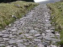 The Highland Council states that the Corrieyairack Pass is not maintained as a public road, and is not suitable for use as one, so it advises against using motor vehicles on the pass.[1] The road surface is made of stone, though it is now very eroded and damaged, and in many places the original paving has been lost. It is now used primarily by hikers and mountain bikers, as well as access for workers maintaining the adjacent electricity pylon line.