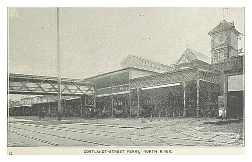 Cortlandt Street Ferry Depot was the main ferry terminal of the Pennsylvania Railroad and the West Shore Railroad on the North River (Hudson River) in lower Manhattan. The railroads operated ferries to their terminal stations on the Hudson River waterfront in New Jersey at Exchange Place and Weehawken, respectively.