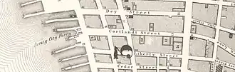 As early as July 1764[1]: 243–246 a ferry began operating from Paulus Hook to Mesier's dock which was located at the foot of Courtland Street (where Cortlandt Street Ferry Depot would be built).[2]: 64 Almost immediately and for several decades subsequently, a complicated series of legal battles broke out over who should operate the ferries, where the crossing(s) should be located and at what rate passengers and other cargo should be charged for the journey.[1]: 243–250