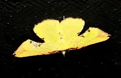 It is generally a yellow moth with brownish tips of the forewings. Two subspecies are recognized: