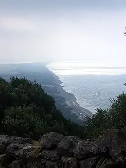 The Capitolium at Cosa marks, as far as we know, the only capitolium constructed in a Latin colony.[18] It was located at the summit of the Arx and would have been visible for miles at sea. Smaller temples to the left and the right accompany the Capitolium, the entire complex accessible from the Forum by the Via Sacra. The Capitolium was oriented ENE and consisted of three cellae with a deep columnar pronaos (with the length of the space equally divided between the cellae and the pronaos). This was preceded by a terraced forecourt. Approaching from this forecourt, one would have faced continuous steps across the entire facade. The temple walls rose from a high podium, its steps oriented on the axis of the Via Sacra.[16] It is believed that the Capitolium was modeled after the 6th-century BC Temple of Jupiter, Juno, and Minerva at Rome. Its moldings are similar to the building traditions of Etruscan and early Roman architecture. The Capitolium was built in the 2nd century BC, most likely as an affirmation of Roman loyalty and identity following the Second Punic War. A square platform is located underneath the Capitolium, cut into the rock but oriented differently than the later building. A crevasse/pit with vegetative remains is located here, suggesting some sort of ritual activity with associated with the religious foundation of Cosa. The exact meaning behind this find is undetermined, the source of much controversy and skepticism.[18]