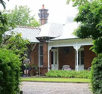 A Federation period home with fine timber detailing and an unusual timber lined meeting room.[15] A large single storey Federation style house constructed of red open kiln bricks with blue brick dressings along the line of the window ledges and above the windows. Mitre slate roof with lead ridging. There are four decorative chimneys of red and blue bricks. Strong veranda details include turned posts, delicately incised timber brackets and lattice valance.[15][1]