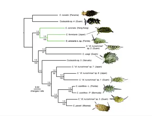 This phylogram shows the results of a study based on the analysis of almost 3,000 base pairs of DNA from four genetic loci which suggest the following evolutionary relationships of the Costasiella species.[14]