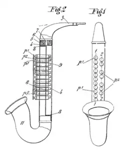 Couesnon was awarded patent no. 569294 for an instrument that was described as a saxophone jouet (lit. 'toy saxophone'). Unlike the saxophone, the couesnophone is a polyphonic instrument with a set of single reeds, one for each of the notes produced, similar to a melodica. The keys are set in a keyboard with a layout similar to that of the early Hohner melodicas,[3] in parallel rows corresponding to the white and black keys of a piano. Its rubber mouthpiece allows the horn be held and played vertically like a saxophone, or horizontally like a flute or melodica.