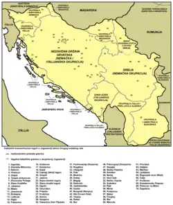 Serbia's borders initially incorporated parts of the territory of five of the prewar banovinas.[31] In October 1941, the Germans ordered the Nedić government to reorganise the territory, as the existing structure was not suitable and did not meet military requirements. By means of an order issued on 4 December 1941, the German military commander adjusted the military-administrative structure to conform to German requirements.[32] As a result, the district (Serbian: okrug) subdivision (which had existed in the Kingdom of the Serbs, Croats and Slovenes prior to the formation of the banovinas) was restored. The Nedić government issued a decree on 23 December 1941 by which Serbia was divided into 14 districts (Serbian: okruzi) and 101 municipalities (Serbian: srezovi).[31] The District of Veliki Bečkerek (also known as The Banat) was theoretically part of Serbia, but became an autonomous district, run by the members of local ethnic German population.[33] On 27 December 1941, the heads of the districts were appointed and met with Milan Nedić, Milan Aćimović, Tanasije Dinić, and Cvetan Đorđević.
