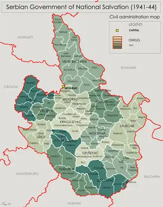 The Government of National Salvation (Serbian: Влада народног спаса, romanized: Vlada narodnog spasa; German: Regierung der nationalen Rettung, abbr. VNS), also referred to as Nedić's government or Nedić's regime, was the colloquial name of the second Serbian collaborationist puppet government established after the Commissioner Government in the German-occupied territory of Serbia[Note 1] during World War II in Yugoslavia. Appointed by the German Military Commander in Serbia, it operated from 29 August 1941 to 4 October 1944. Unlike the Independent State of Croatia, the regime in occupied Serbia was never accorded status in international law and did not enjoy formal diplomatic recognition of the Axis powers.[2]