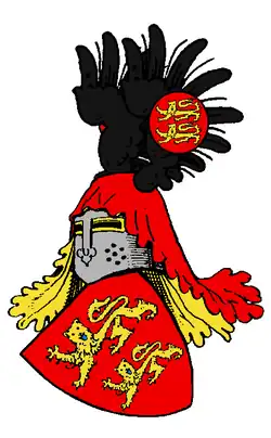 - The later hereditary arms maintain the same design, with the addition of a black headdress atop the helm, supporting a round red disc embellished with two golden leopards.[1]