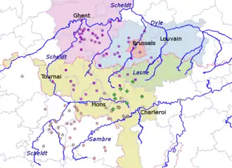 The medieval pagi of Hainaut (pink dots) and Brabant (purple dots) are compared to the modern provinces of Belgium (colours). Modern Belgian Hainaut is yellow, showing that a large proportion of it (since 1071) was originally in old Brabant.