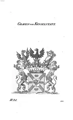 Emperor Josef II elevated the Reichsfreiherren (Imperial Barons) of Keselstatt to the status of Reichsgrafen (Imperial Counts) in 1776.[1] The title of Count of Kesselstatt (German: Graf von Kesselstatt) is accompanied by the style of His Excellency; wives and daughters of Counts of Kesselstatt would be "Her Excellency Countess Forename of Kesselstatt". They are cousins of the Princely Family of Liechtenstein.