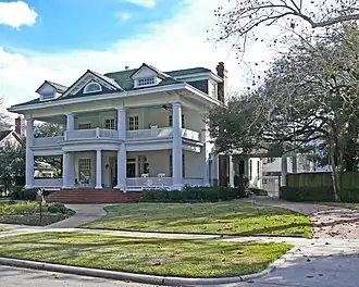 The C. L. "Baron" Neuhaus House at 6 Courtlandt Place was designed in the Colonial Revival style by Sanguinet & Staats for the local banker in 1910 (NRHP-listed). This was the first home finished in the subdivision.[3] The property also included outbuildings, partly to support small-scale farming activities. The lot included a hen house, two stables, a garage, and servants quarters.[7]
